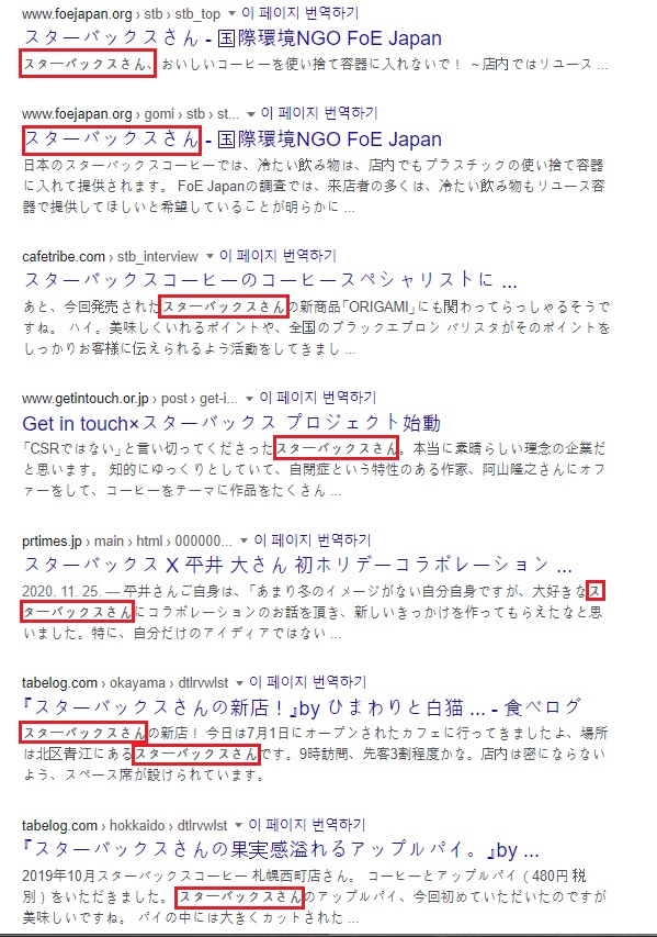 ⇒ 세븐일레븐さん(X), 로손さん(X), 훼미리마트さん(X), 마쿠도さん(X), 스타벅스さん(X)